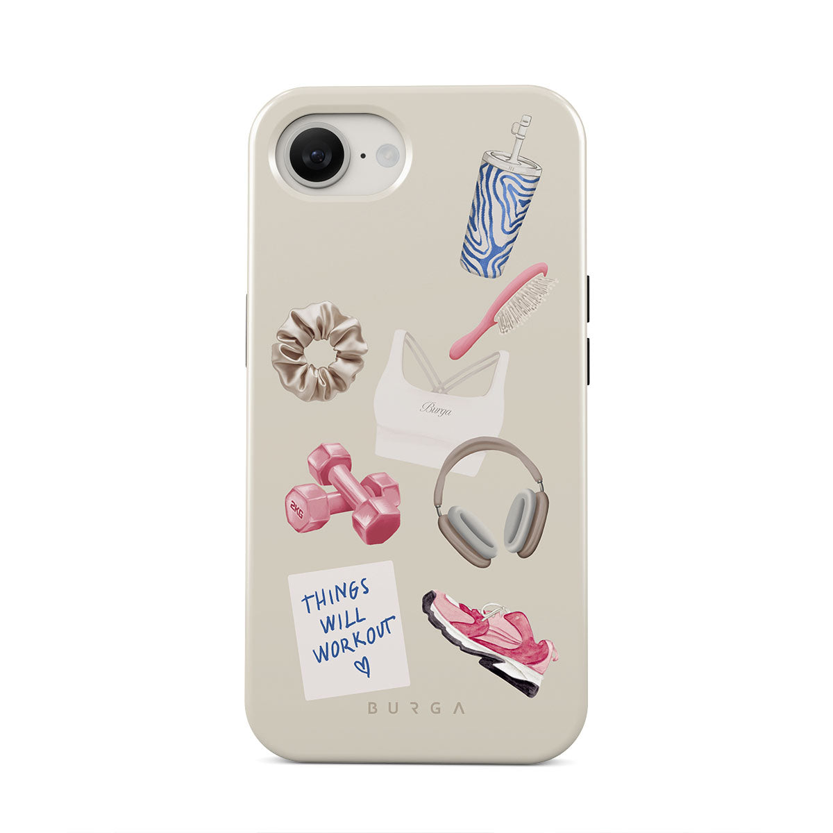 This design features: dumbbells, headphones, tumbler, hairbrush, pink trainers, sports bra, crunchie, "Things Will Work Out" sticky note