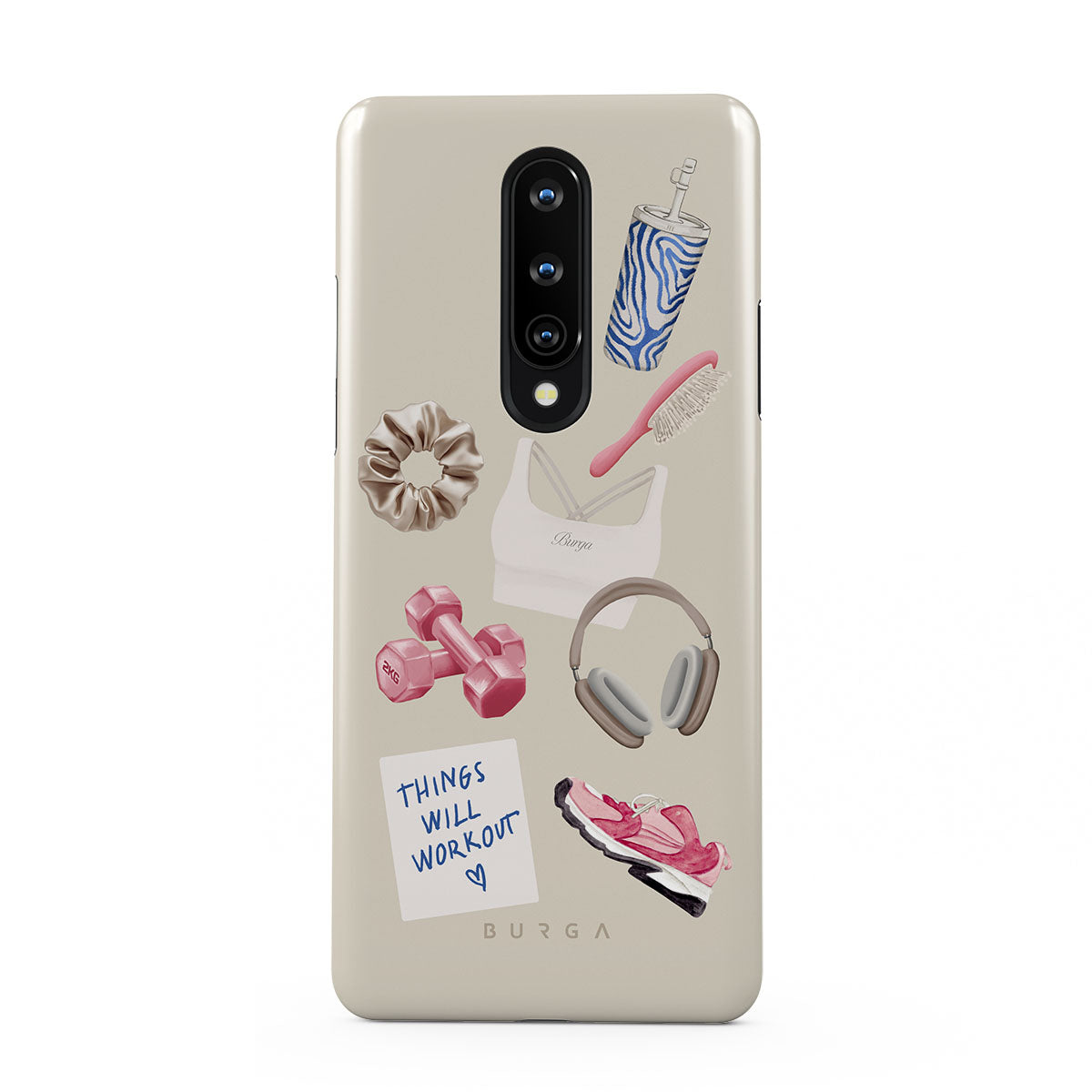 This design features: dumbbells, headphones, tumbler, hairbrush, pink trainers, sports bra, crunchie, "Things Will Work Out" sticky note