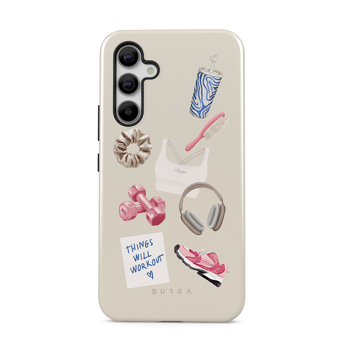 This design features: dumbbells, headphones, tumbler, hairbrush, pink trainers, sports bra, crunchie, "Things Will Work Out" sticky note