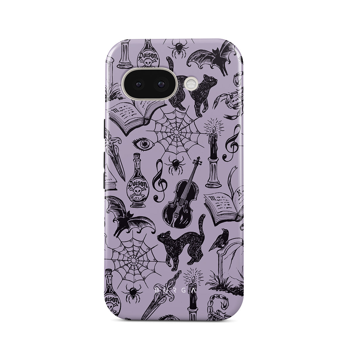 This design features: gothic doodles, mystical elements, spiders, spiderweb, cat, violin, eye, candle, dagger, book, bat, crow, scorpion
