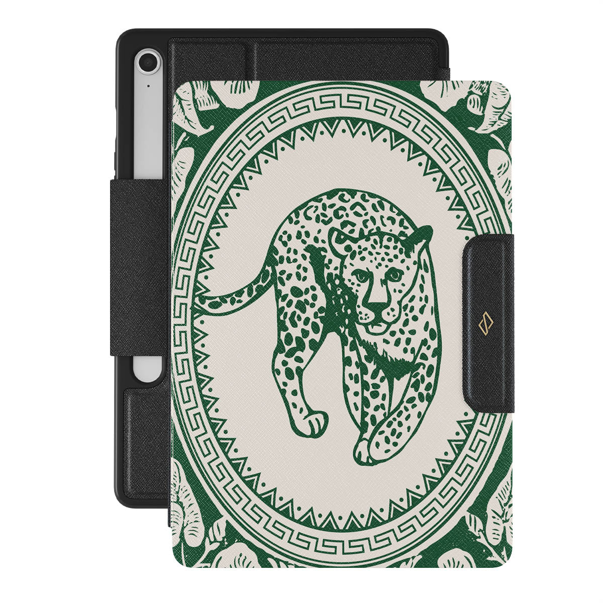 Our Antique Samsung Galaxy Tab S10 FE folio case design—a nude canvas kissed by refined green contours, painting an eternal saga of elegance. Enthroned at its center is a regal leopard embraced by a tender floral caress. A nod to timeless opulence, this design captures the essence of vintage prestige.