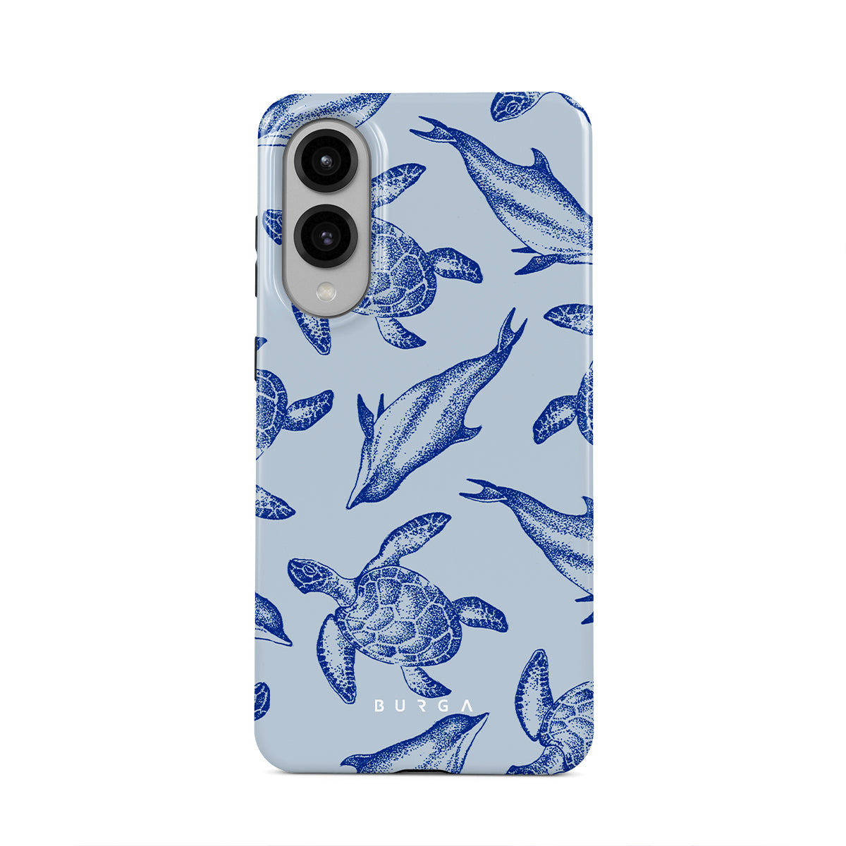 A beautiful design featuring lively turtles and dolphins playfully dancing in serene light blue water. Dive into the ocean's rhythm with our Aquatic Dance Samsung Galaxy S25 Edge case.