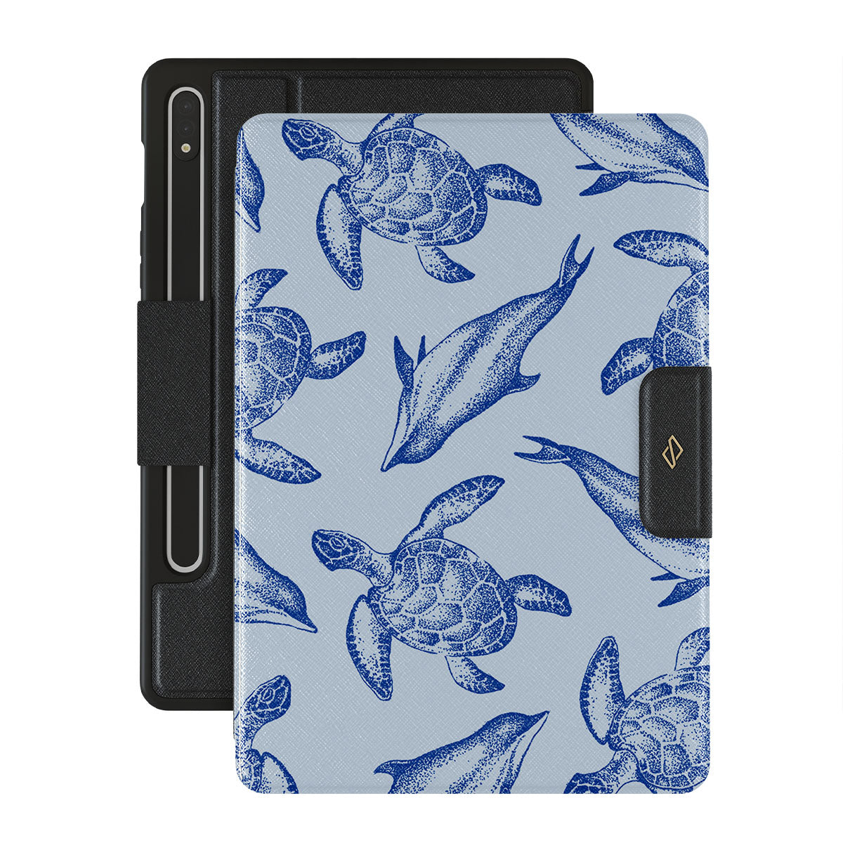 A beautiful design featuring lively turtles and dolphins playfully dancing in serene light blue water. Dive into the ocean's rhythm with our Aquatic Dance Samsung Galaxy Tab S8/S7 folio case.