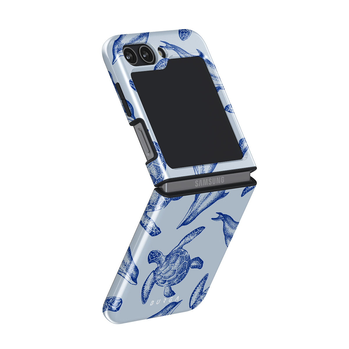 A beautiful design featuring lively turtles and dolphins playfully dancing in serene light blue water. Dive into the ocean's rhythm with our Aquatic Dance Samsung Galaxy Z Flip 5 case.