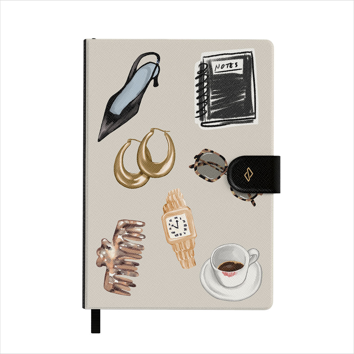 This design features: black high heel, gold hoop earrings, black notebook, coffee cup, tortoiseshell glasses, brown scrunchie, retro gold watch.