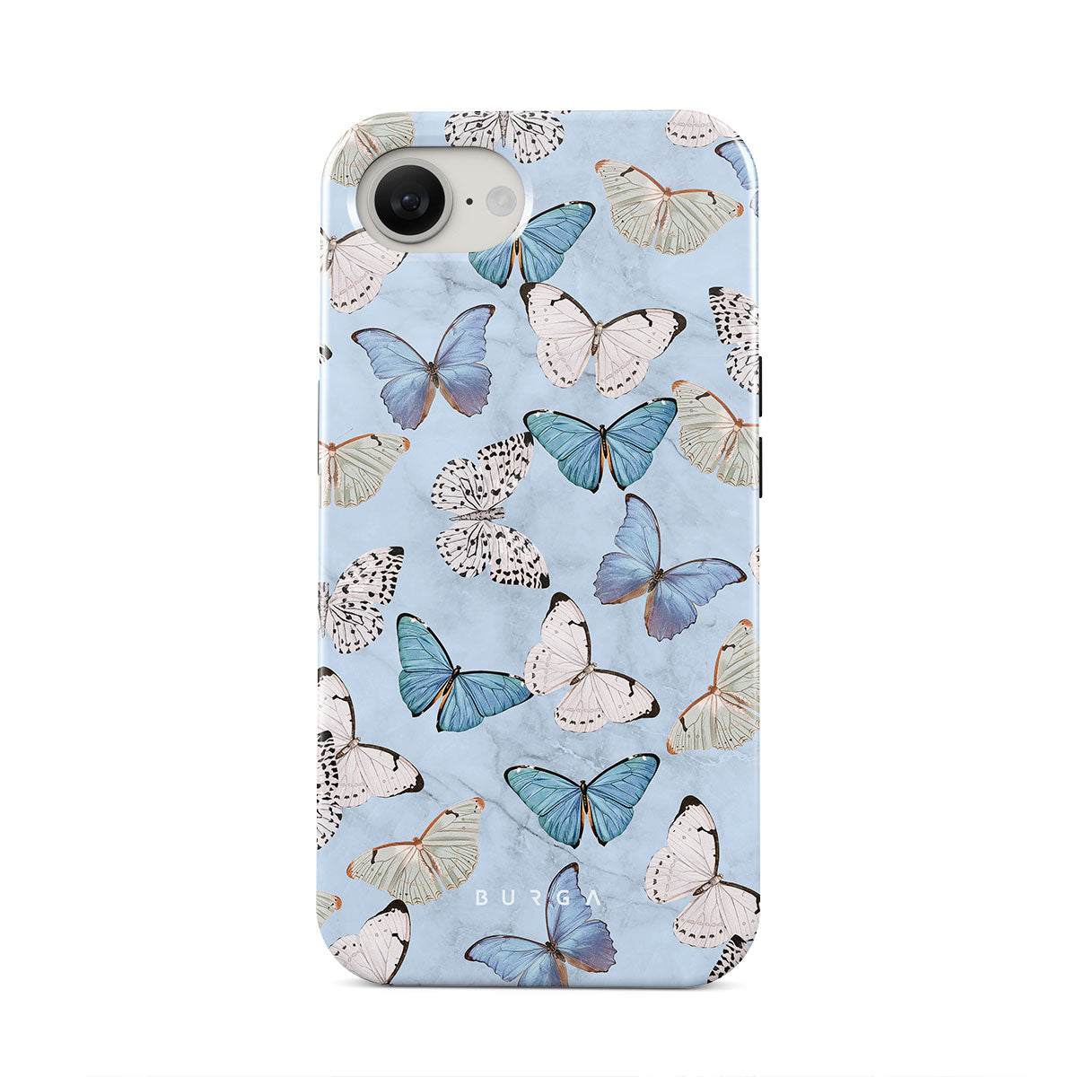 Pastel blue and a playful pattern of summery butterflies create a dreamy combination in our iPhone 16e phone case. Carry the feeling of the butterflies in your stomach while protecting your phone from any dangers, as the hard-shell case will keep it sound and safe.