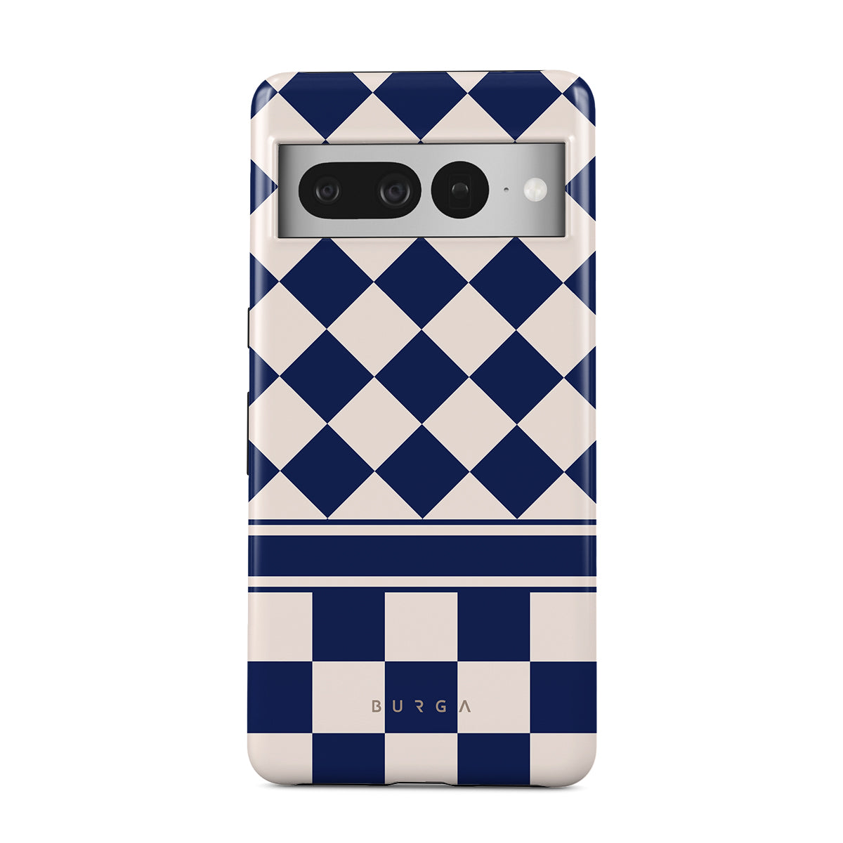 Embrace the essence of subtle luxury with our Check & Mate Google Pixel 7 Pro phone case design. Blending eggshell and deep blue checkers, it evokes whispers of elegance. While diamonds grace the upper half, the lower half features a timeless chessboard pattern.