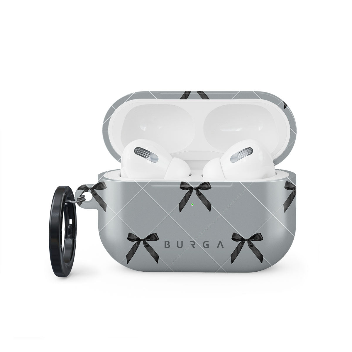 A subtle hint to a world of dance and soft melodies. Crisscrossing bows over a muted gray tone capture the flirtatious essence of the coquette-core aesthetic. Playful and sweet, our Coquette Apple Airpods Pro 2 case cover design is perfect for those who find beauty in the details.
