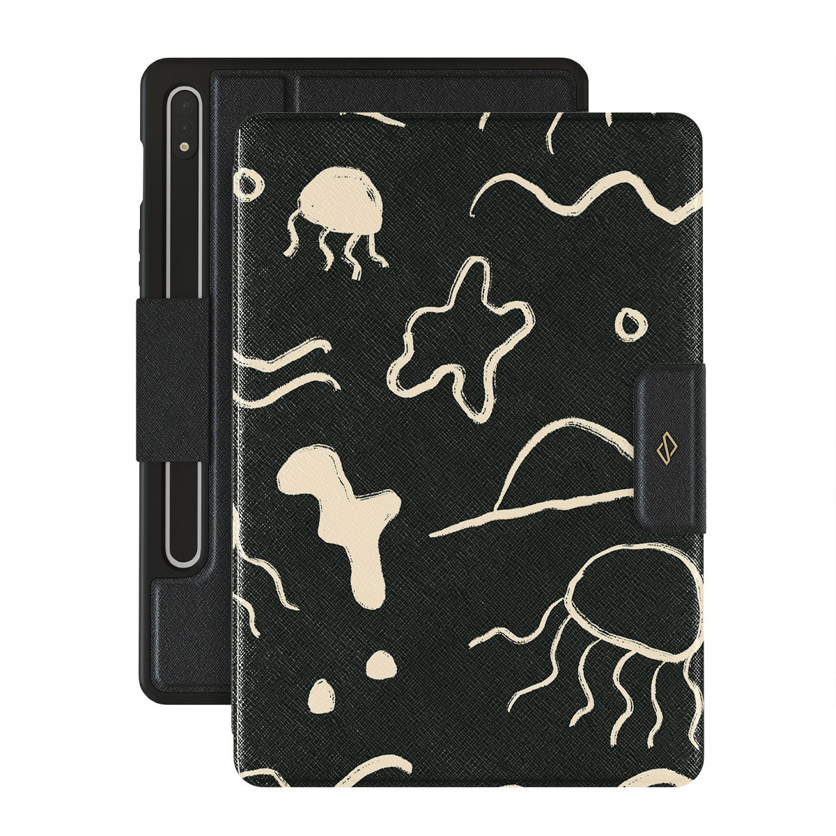 Our Eclipse Samsung Galaxy Tab S9+ folio case reflects the enigmatic beauty of the ocean during a solar eclipse. The dark hues and bright accents represent how the light dances on the water, while the waves and jellyfish capture the serene yet dynamic nature of the ocean.