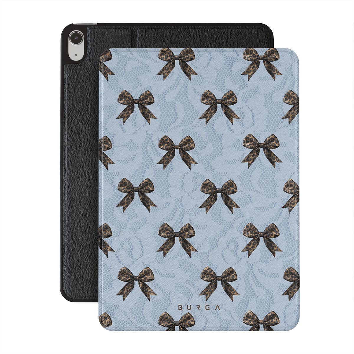 For those who command attention with subtle elegance, our Fashionista iPad Air 11 (7th/6th Gen) folio case design is your go-to. A soft blue background, accented by dark grey bows and subtle lace patterns, exudes polished, effortless style. It's quiet confidence with a hint of charm.