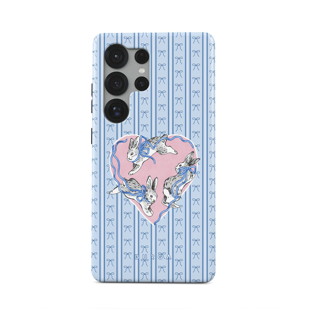 This design features: white rabbits, heart frame, blue stripes