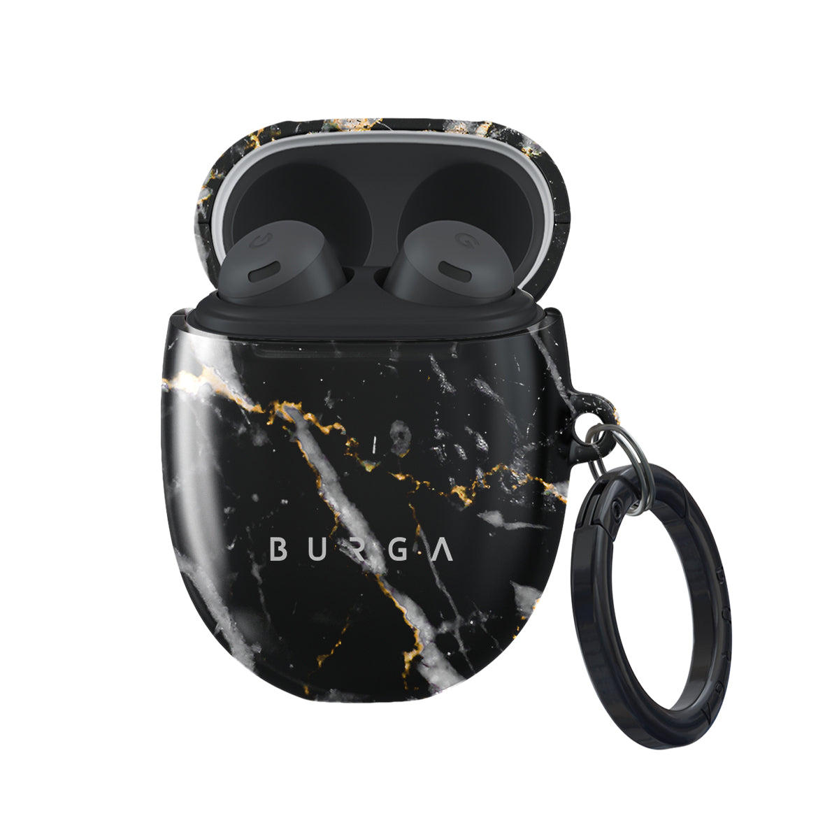 Google Pixel Buds Pro case cover displays a classical black and white marble enriched with gold specks. Such introduction of golden marble details radiates elegance and is a fantastic addition to every wardrobe. Our case fits perfectly snug around Google Pixel Buds Pro . “Like a glove!” one might say. And it won’t disrupt the wireless charging capabilities of the newer model. There’s even an LED light indicator to prove it (don’t worry, wired charging still works, too). When fitted, the BURGA case will protect the delicate Google Pixel Buds Pro case beneath it from scratches, bumps, and drops while remaining scratch-free itself. Our signature design pattern prints are High Quality, and will never peel or fade away- thanks to our unique printing technology. And finally, a handy carabiner is there to make your life easier and more convenient: just snap it around your keys or belt loop and tackle the day head-on. Your music is right there by your side when you need it.