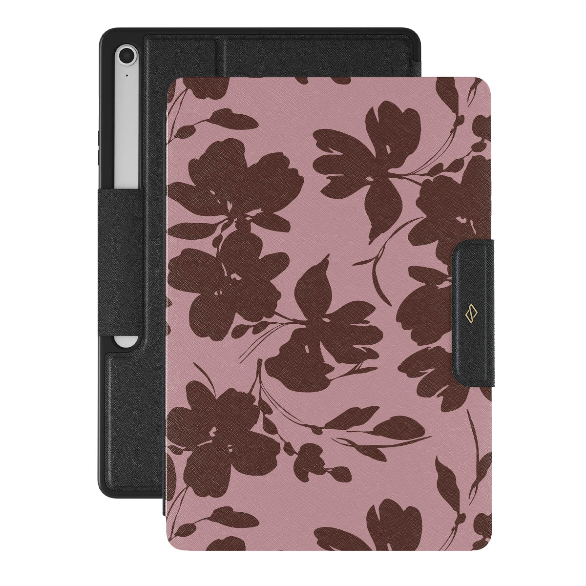 Quietly bold, our Gossip Samsung Galaxy Tab S10+ FE folio case design speaks volumes in subtlety. A soft rosé background, layered with deep red-brown floral accents, gives off a refined, almost mysterious vibe. It's for those who let the details do the talking.