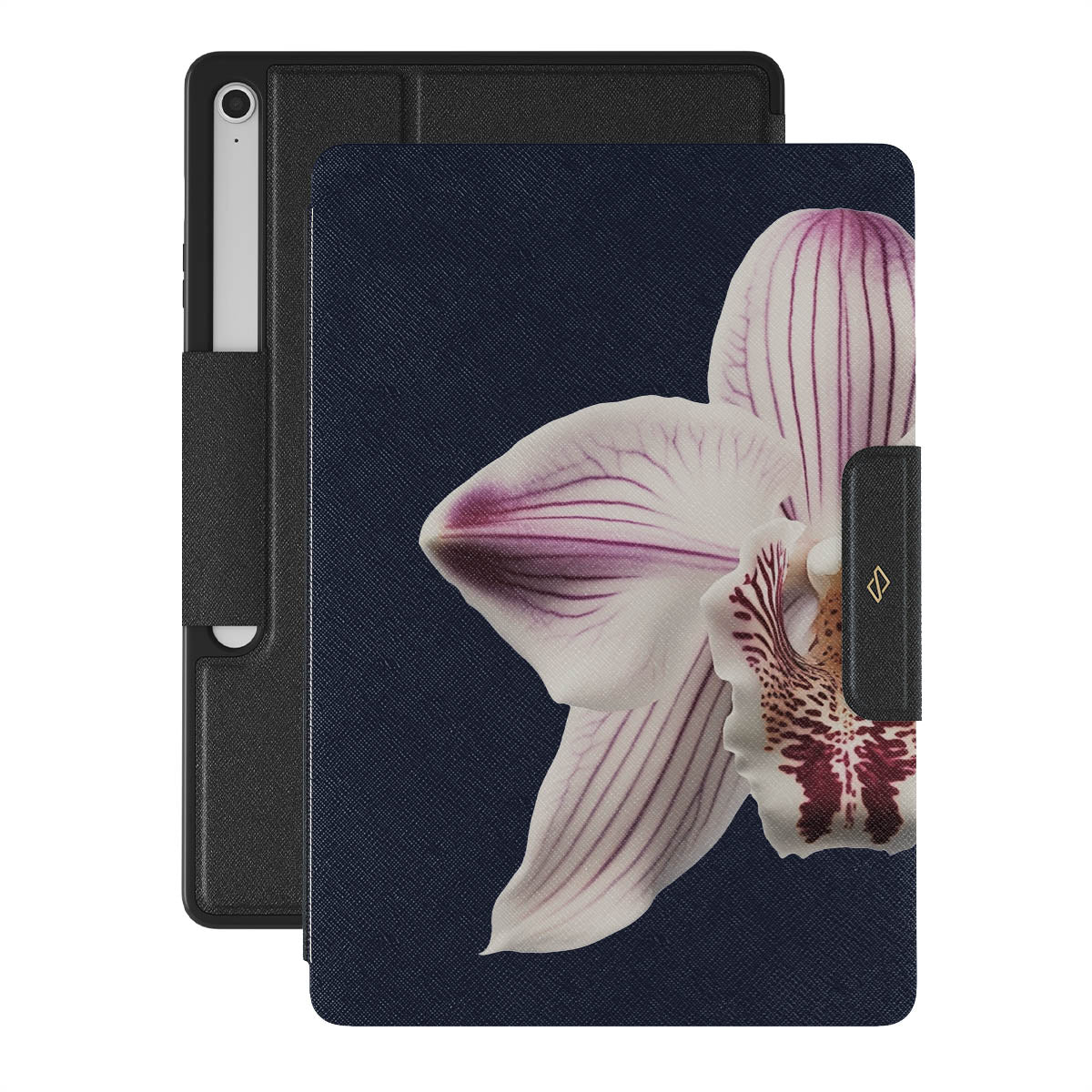 The white orchid blooms boldly upon a night sky blue, a beacon of clarity in the darkness. Our Nectar Samsung Galaxy Tab S10+ FE folio case design speaks to the soul's desire to find light within, to illuminate the hidden paths of self-discovery that only reveal themselves under the cloak of introspection.