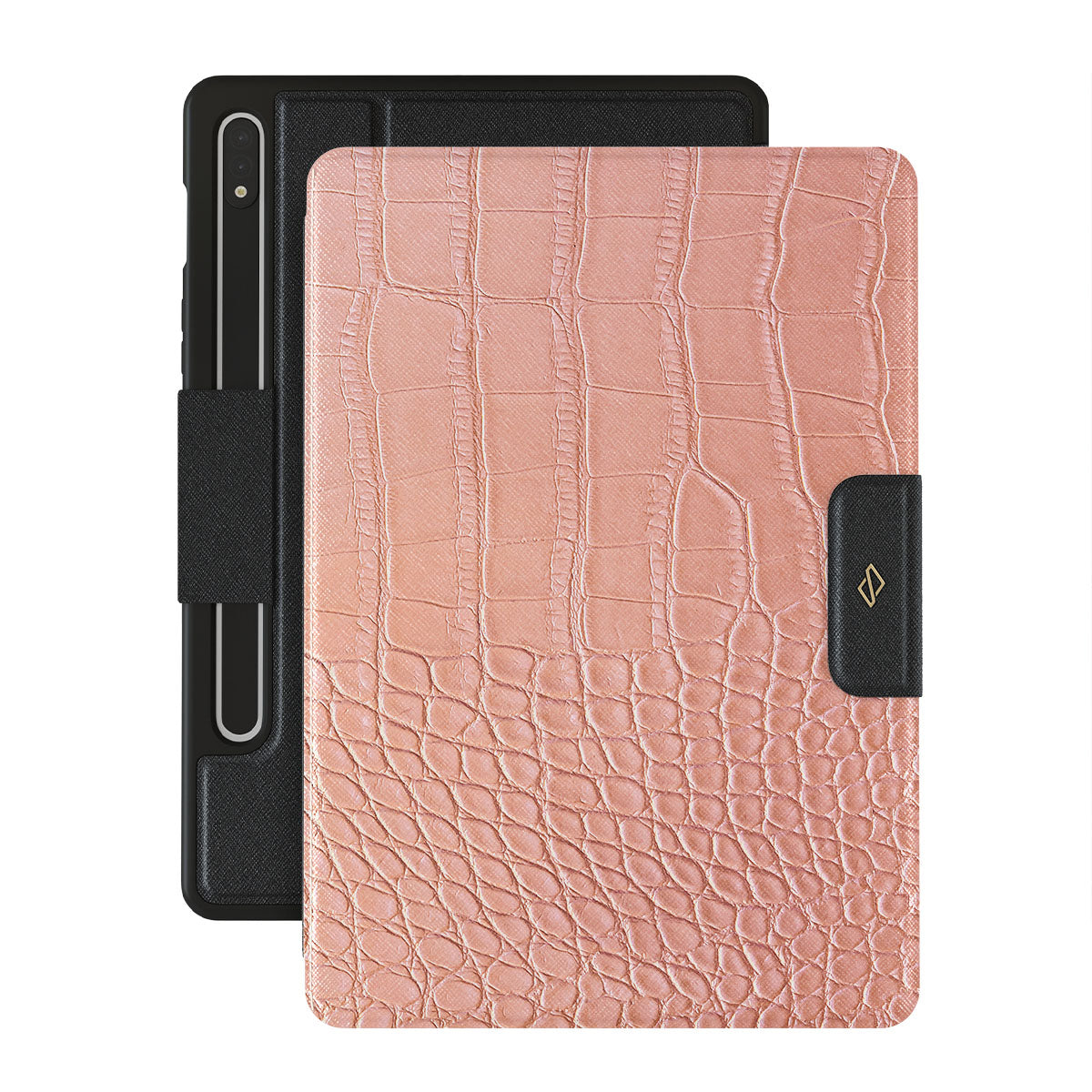 Our Pink Croco-it is a printed pattern * Samsung Galaxy Tab S9 FE folio case features a classic crocodile design reimagined and showcased in a soft coral shade. The new take on the dangerous animal print will add a touch of softness to your style while simultaneously offering heavy-duty protection to your device.