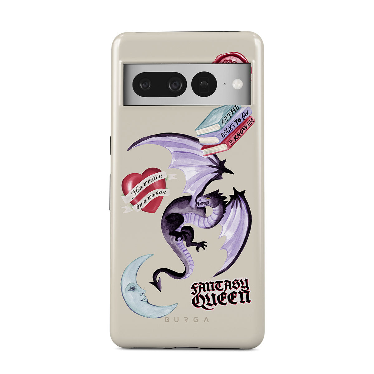 This design features: purple dragon, "Fantasy Queen" sticker, crescent moon, purple wax seal, heart with message, books