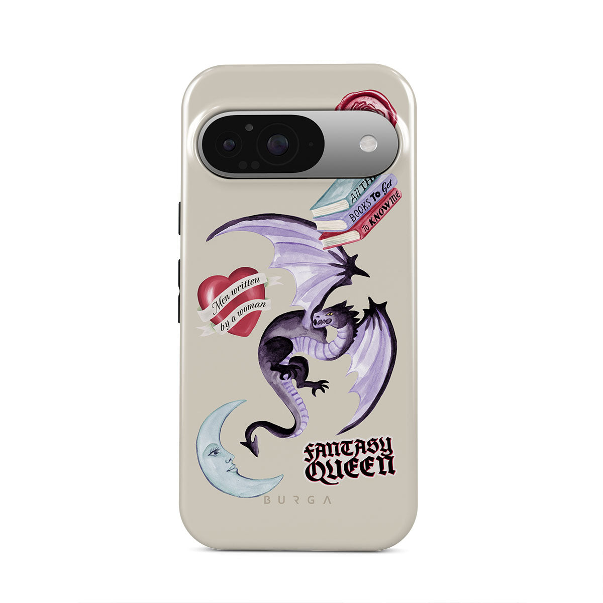 This design features: purple dragon, "Fantasy Queen" sticker, crescent moon, purple wax seal, heart with message, books
