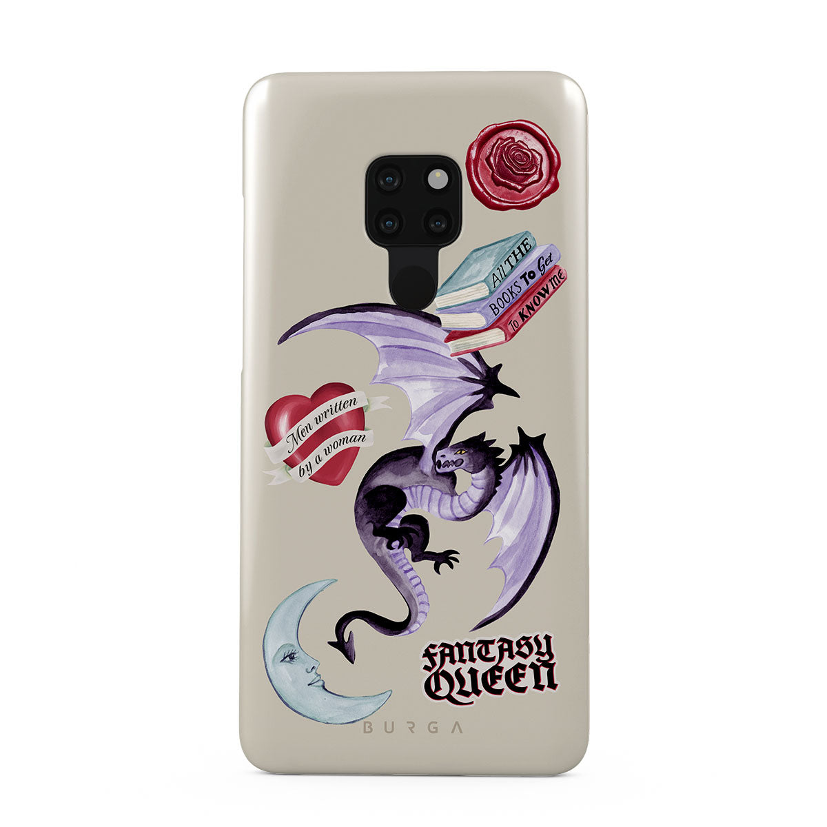 This design features: purple dragon, "Fantasy Queen" sticker, crescent moon, purple wax seal, heart with message, books