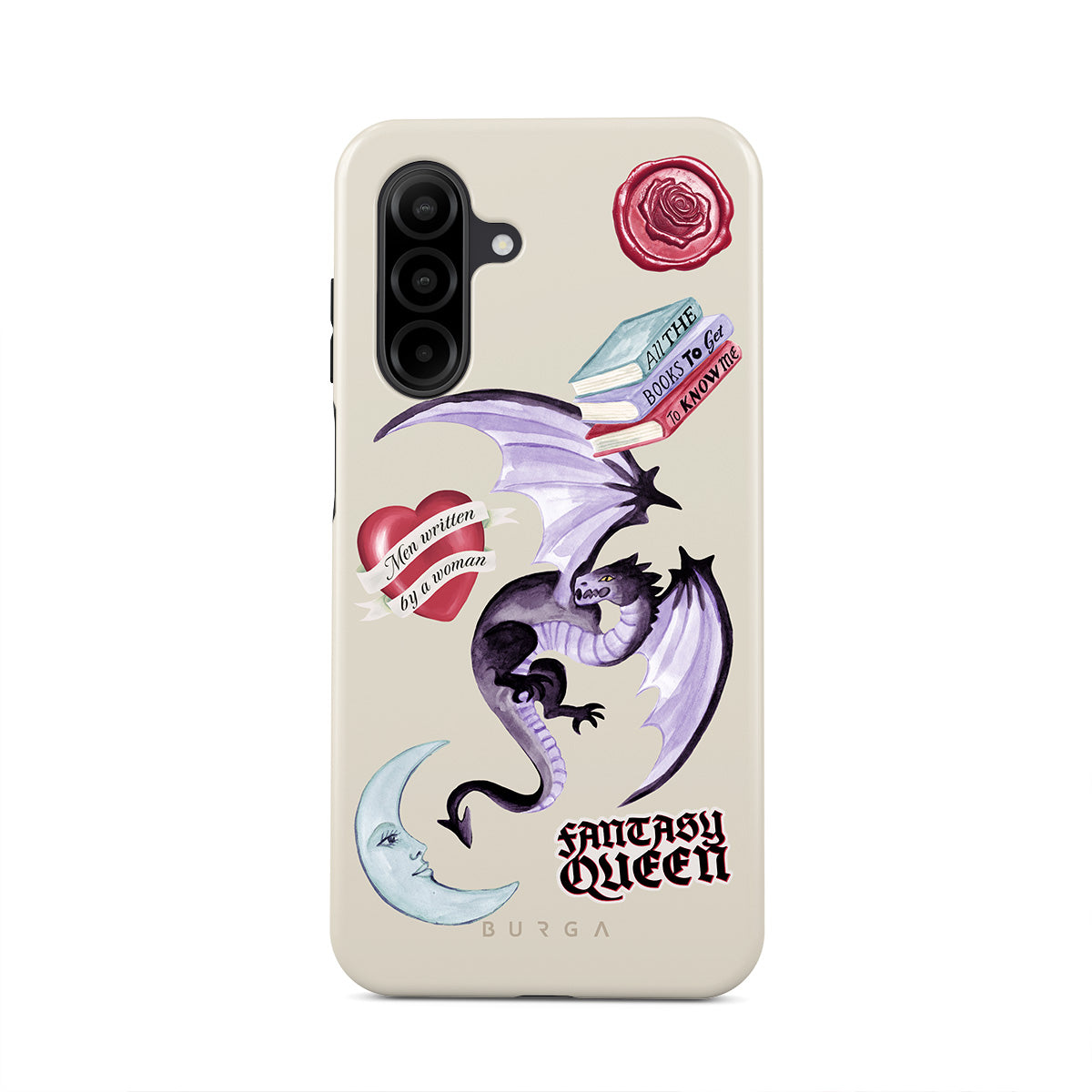 This design features: purple dragon, "Fantasy Queen" sticker, crescent moon, purple wax seal, heart with message, books