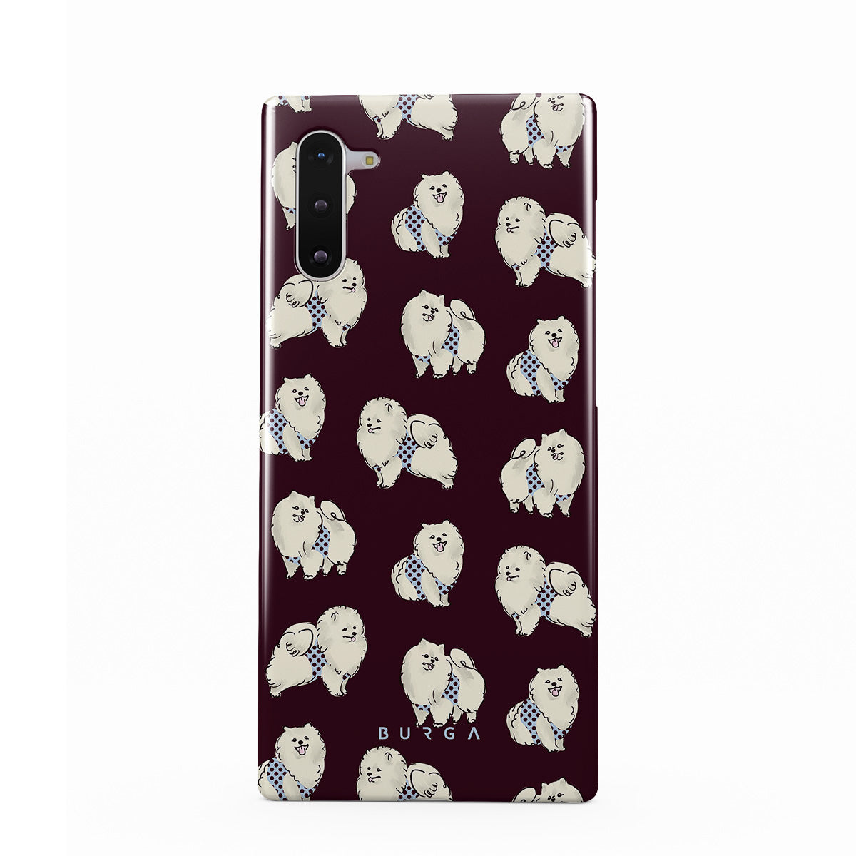 This design features: white fluffy dogs on a deep burgundy background, poodles, pets.