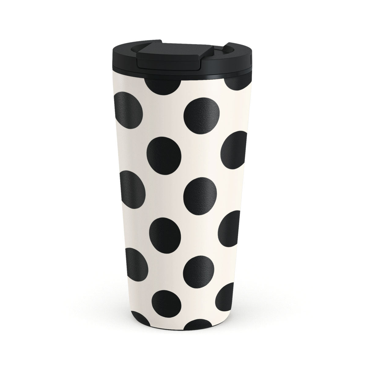 This design features: black polka dots on a clean white background.