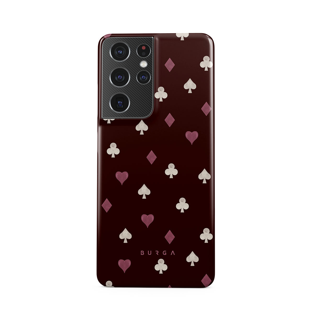 Nothing is as it appears. Hearts, clubs, diamonds, and spades—stacked in your favor or playing against you? This Samsung Galaxy S21 Ultra phone case design features a rich burgundy background and minimalist suits that make for a game where the rules are constantly shifting.