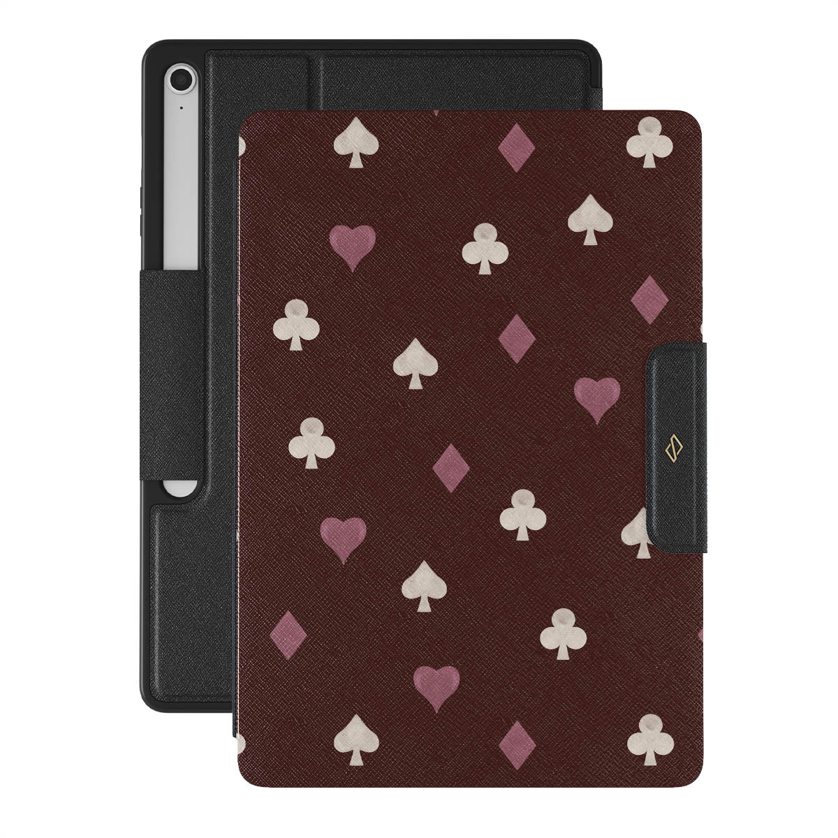 Nothing is as it appears. Hearts, clubs, diamonds, and spades—stacked in your favor or playing against you? This Samsung Galaxy Tab S10+ FE folio case design features a rich burgundy background and minimalist suits that make for a game where the rules are constantly shifting.