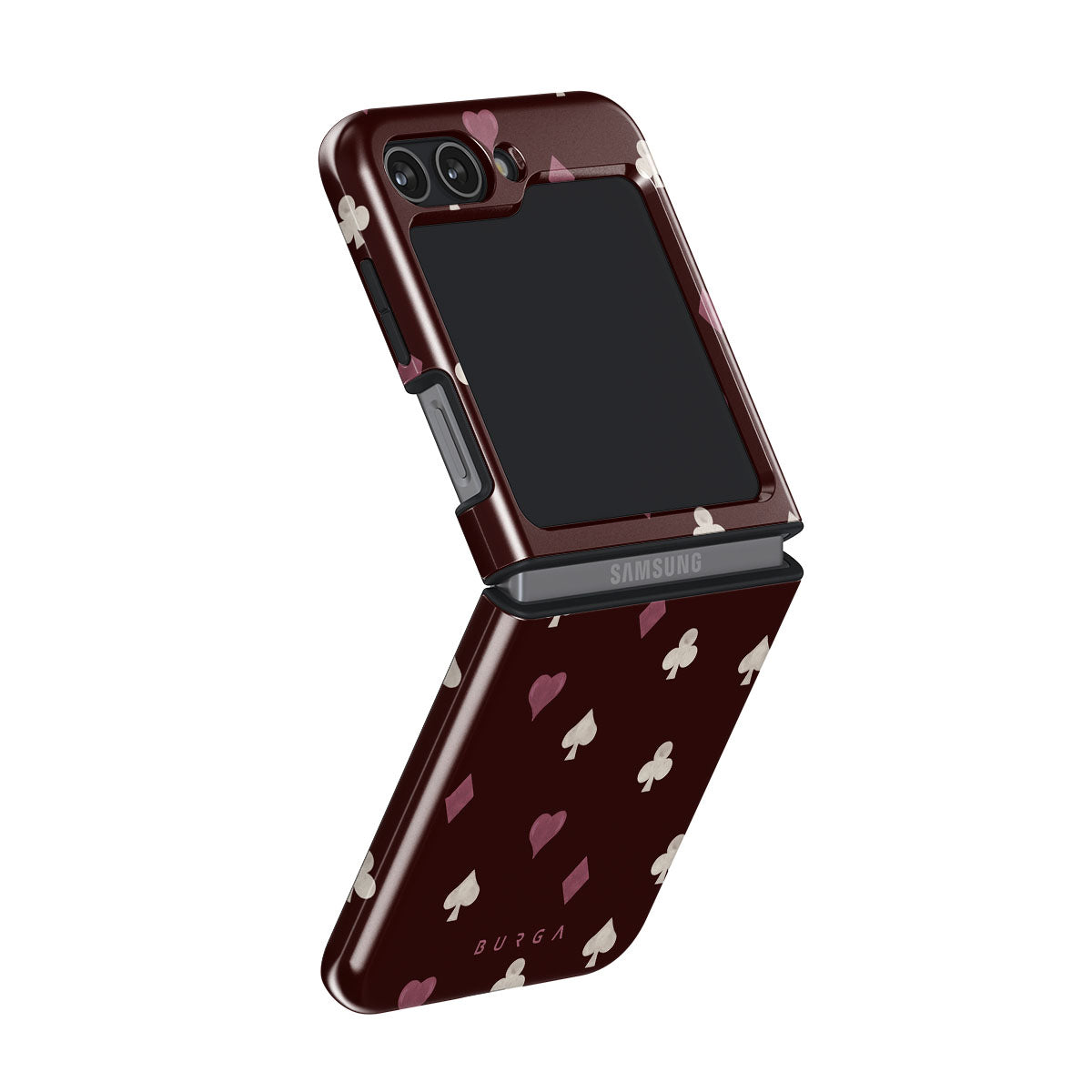 Nothing is as it appears. Hearts, clubs, diamonds, and spades—stacked in your favor or playing against you? This Samsung Galaxy Z Flip 5 phone case design features a rich burgundy background and minimalist suits that make for a game where the rules are constantly shifting.