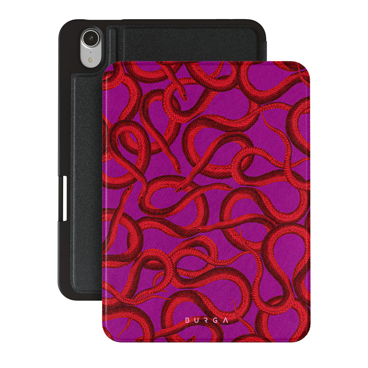 Watch Out iPad Mini 8.3 (A17 Pro/6th Gen) 2021 folio case design offers a fierce feel with a bright magenta colored background covered in red snakes pattern. Make a statement while protecting your iPad, as this case is guaranteed to catch everyone's eye.
